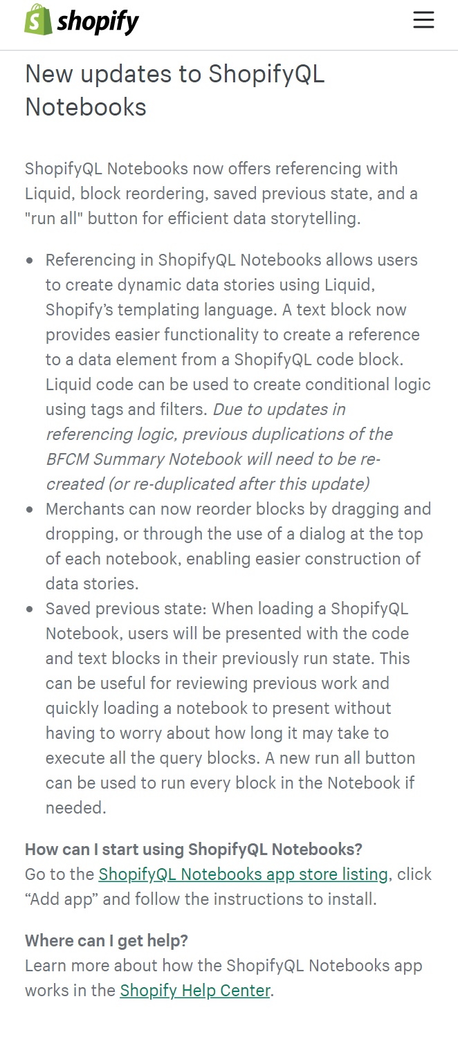 值得一提的是,近日,Shopify升级ShopifyQL Notebooks功能,全新升级的ShopifyQL Notebooks将提供Liquid参考、文本块/代码块重新排序、保存历史状态等功能。商家可以通过点击“一键运行”按钮,快速实现数据故事化。