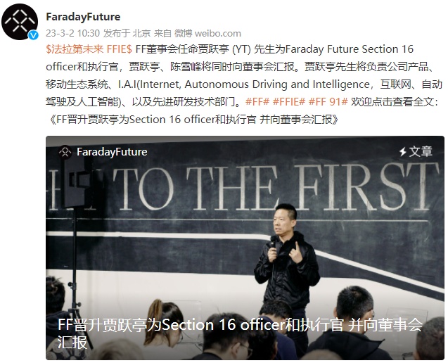 考虑到贾跃亭对公司的产品、技术创新、I.A.I、先进技术、产品和技术力提升、公司发展具有长远重要价值和不可或缺的重要意义,以及观察到贾跃亭在公司近期的融资和刚刚结束的特别股东大会投票通过增加授权股数提案等方面作出的重要贡献,董事会经过慎重考虑后同意将Faraday Future创始人兼首席产品及用户生态官(CPUO)贾跃亭晋升为Section 16 Officer及公司执行官。