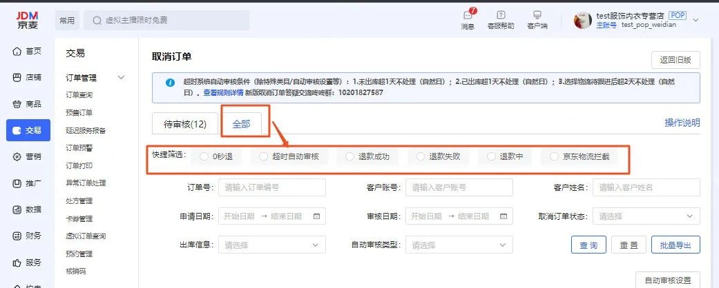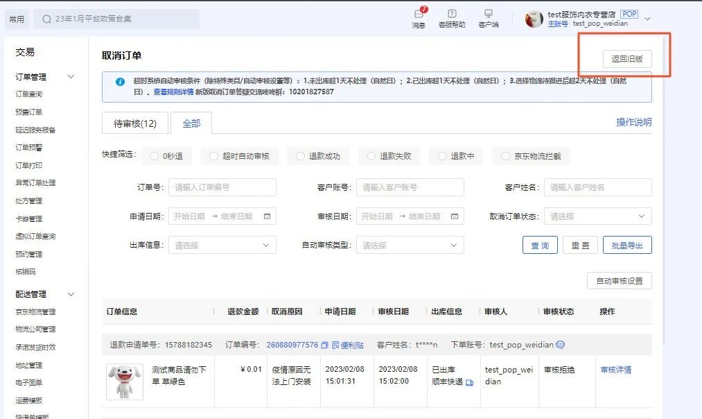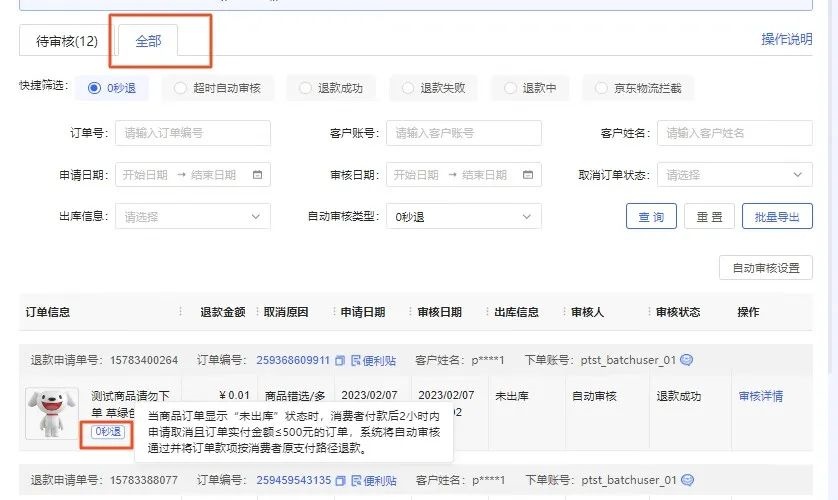 在“全部”页签,新增0秒退、超时自动审核标签,商家可根据标签或取消订单进度进项快捷筛选,方便查看;同时,取消订单状态包含全部状态:待审核、退款中、审核拒绝、退款成功、退款失败、京东物流拦截、京东拦截失败、强制退款、商家线下拦截、用户撤销、待商家确认收货、取件失败、客户放弃、已收货。