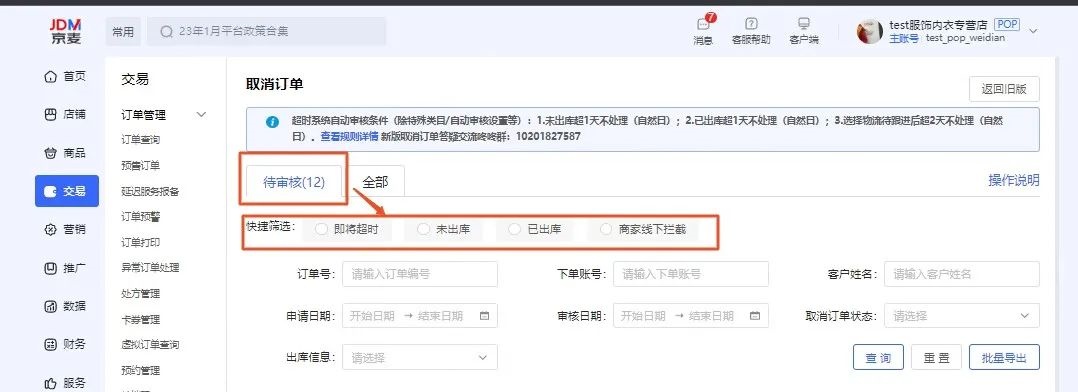 具体来看,在“待审核”页签,商家可根据订单物流状态、订单审核状态进行快捷筛选,从而提升操作效率;需要注意的是,待审核列表取消订单状态仅包含需商家进行操作的订单状态即待审核、商家线下拦截(选择快递拦截审核项后的订单状态)。