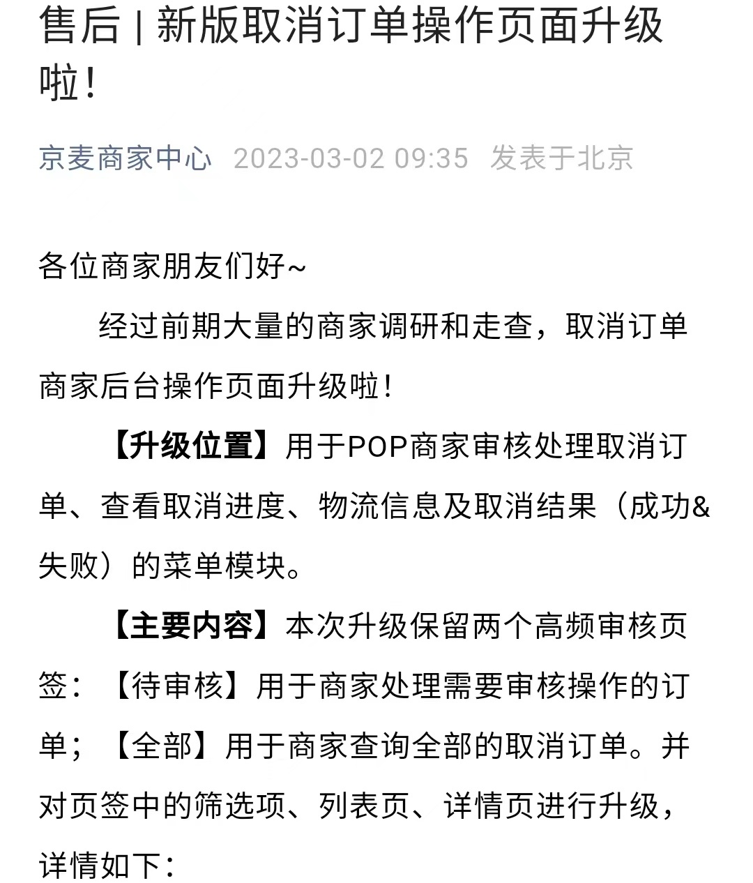 3月2日消息,京麦商家中心公告称,经过前期大量的商家调研和走查,已对取消订单商家后台操作页面进行升级。升级位置为用于POP商家审核处理取消订单、查看取消进度、物流信息及取消结果(成功&失败)的菜单模块。