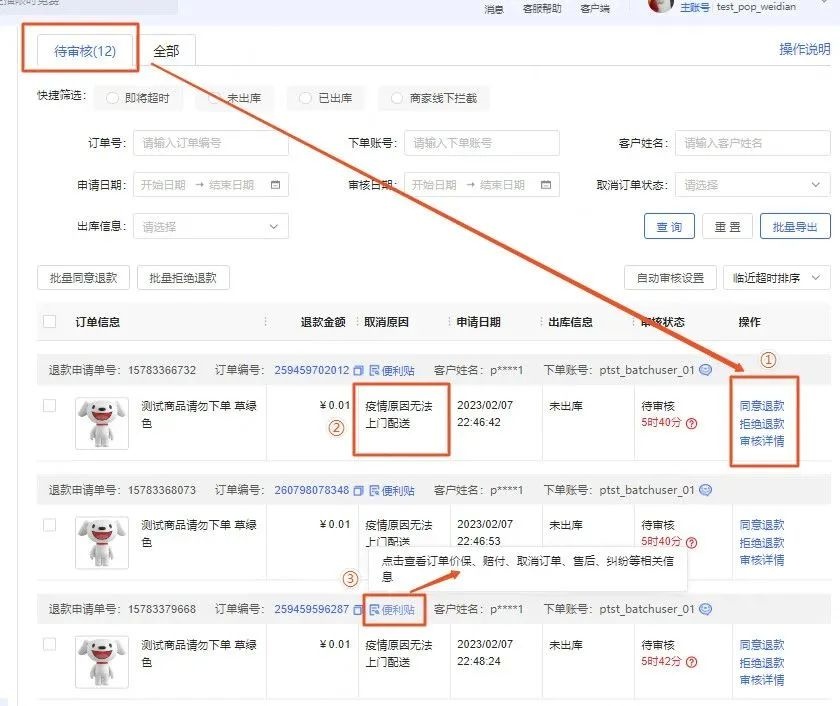 具体来看,在“待审核”页签,列表页可直接进行审核操作,包括同意退款、拒绝退款、物流拦截(列表页以系统物流状态为准);新增用户提交的取消原因;新增便利贴功能,可查看该订单价保、纠纷、赔付、取消订单、售后等相关信息;商家点击订单商品名称,可跳转至商品链接。
