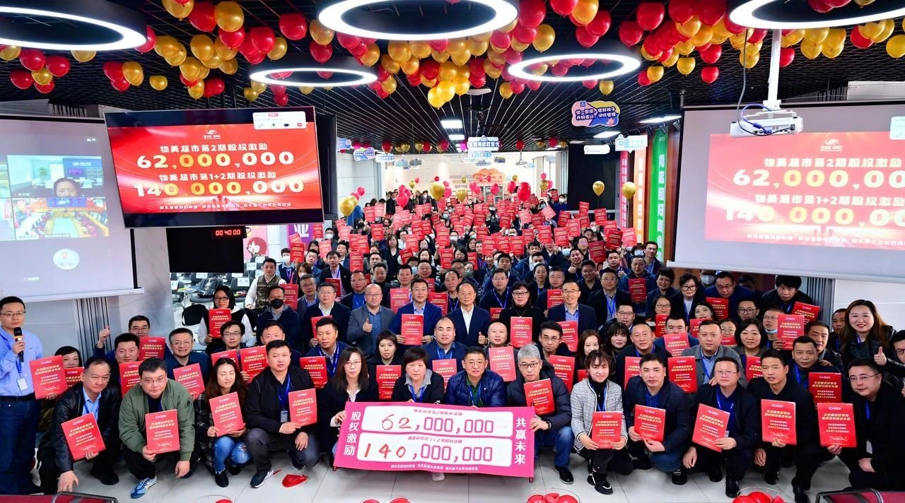 3月8日消息,物美集团日前在北京总部召开年度绩效考评启动会暨股权分红大会,本次大会主题为“全面推进数智化,彻底回归商业本质”,采取多地联动方式,将华东、天津物美的优秀股东代表请到北京大会现场,举行表彰并发放第二期股权激励分红收益6200万元,一、二期合计1.4亿元。