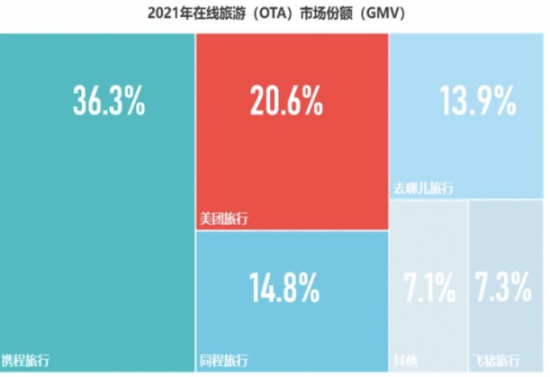 2021年,携程、去哪儿市场份额分别为36.3%、13.9%,同比下滑了4.4%、3.6%。而美团、同程旅行的市场份额持续上升,分别达到20.6%、14.8%,携程的行业“老大”位置受到了威胁。