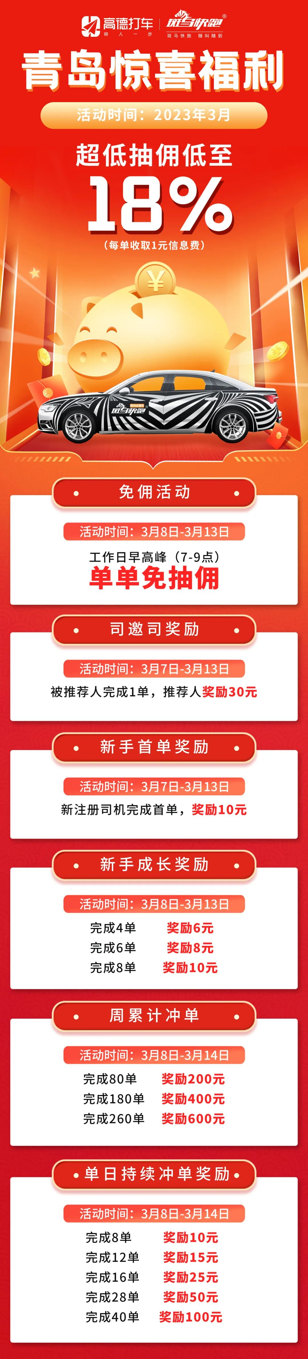 对青岛斑马快跑司机而言,3月8日-3月13日,工作日早高峰期间可以获得“单单免抽佣”,推荐新司机可享受现金奖励,同时还有日冲单奖、周冲单奖等福利。