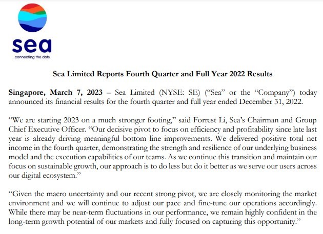 3月7日消息,Shopee母公司Sea今日发布了截至2022年12月31日的第四季度及2022年全年财报。