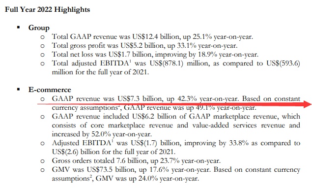 2022年,Shopee总订单数76亿,同比增长23.7%;GMV为735亿美元,同比增长17.6%;调整后EBITDA为17亿美元,与2021全年的26亿美元相比,增长了33.8%。