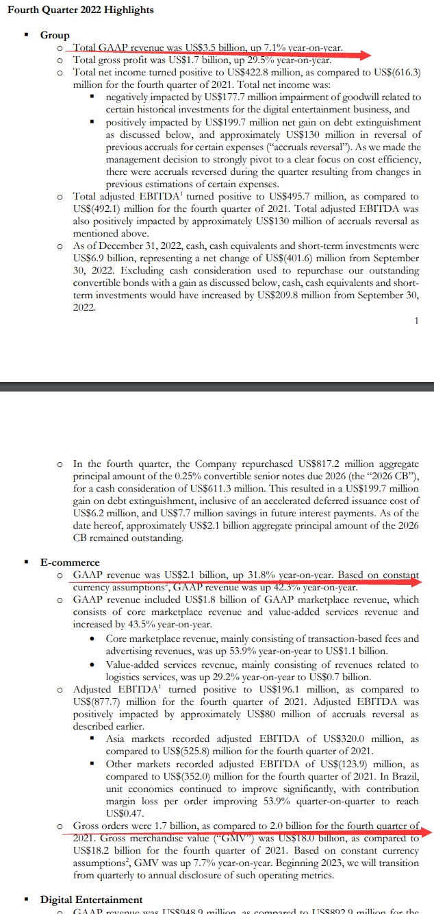 第四季度Shopee总订单数17亿,而2021年第四季度为20亿;GMV为180亿美元,而2021年第四季度为182亿美元;调整后EBITDA为1.961亿美元,而2021第四季度为8.777亿美元