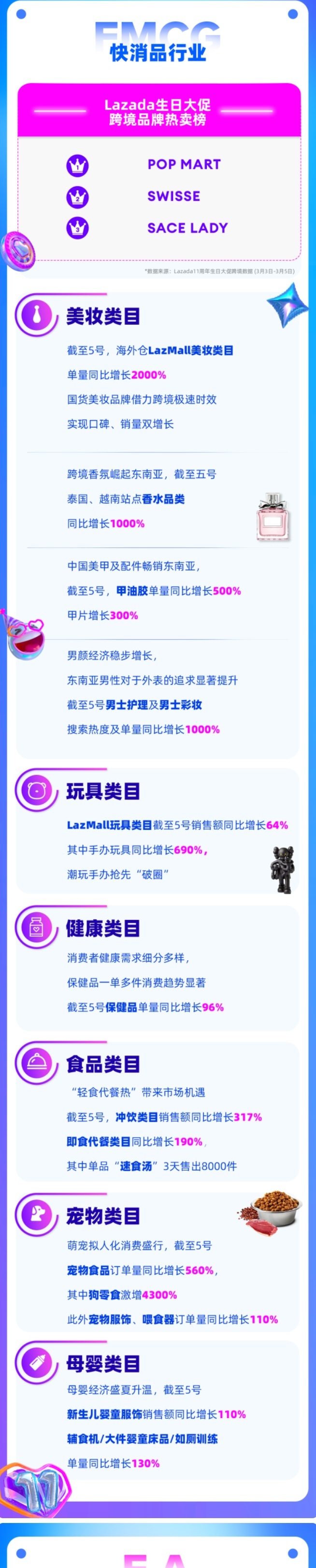 值得一提的是,Lazada日前发布11周年生日大促跨境数据(3月3日-3月5日)。在快消品行业,Lazada生日大促跨境品牌热卖榜前三的分别是:POP MART、SWISSE、SACE LADY。