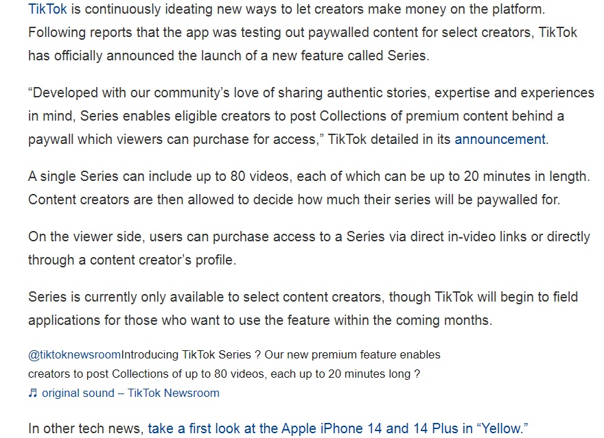 Series功能允许内容创作者制作可供购买的视频集,每个系列中最多可以有80个视频,单个视频可以长达20分钟,这种长度感觉更接近于YouTube的vlog,而不是短视频。创作者将能够设置视频的价格,从1美元到190美元不等,粉丝可以通过视频中的链接或创作者的个人资料页面购买。