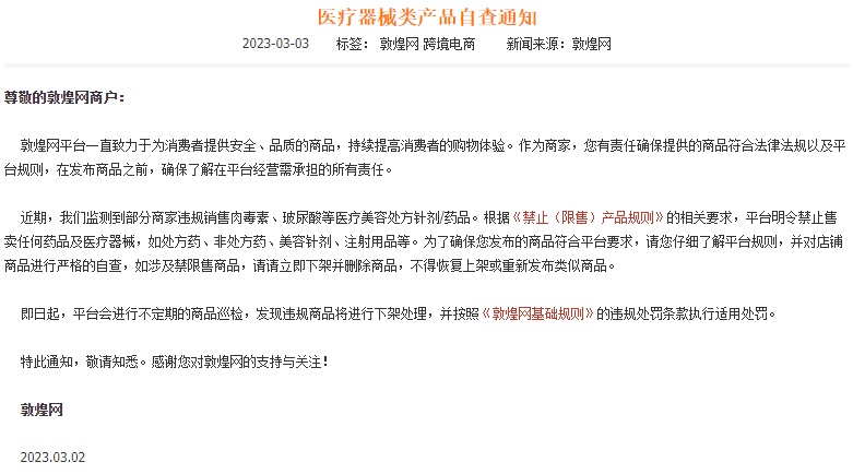 敦煌网近日还发布医疗器械类产品自查通知,作为商家,有责任确保提供的商品符合法律法规以及平台规则,在发布商品之前,确保了解在平台经营需承担的所有责任。