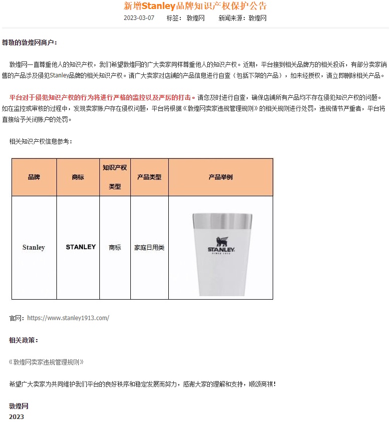 公告称,近期,平台接到相关品牌方的相关投诉,有部分卖家销售的产品涉及侵犯Stanley品牌的相关知识产权。请广大卖家对店铺的产品信息进行自查(包括下架的产品),如未经授权,请立即删除相关产品。
