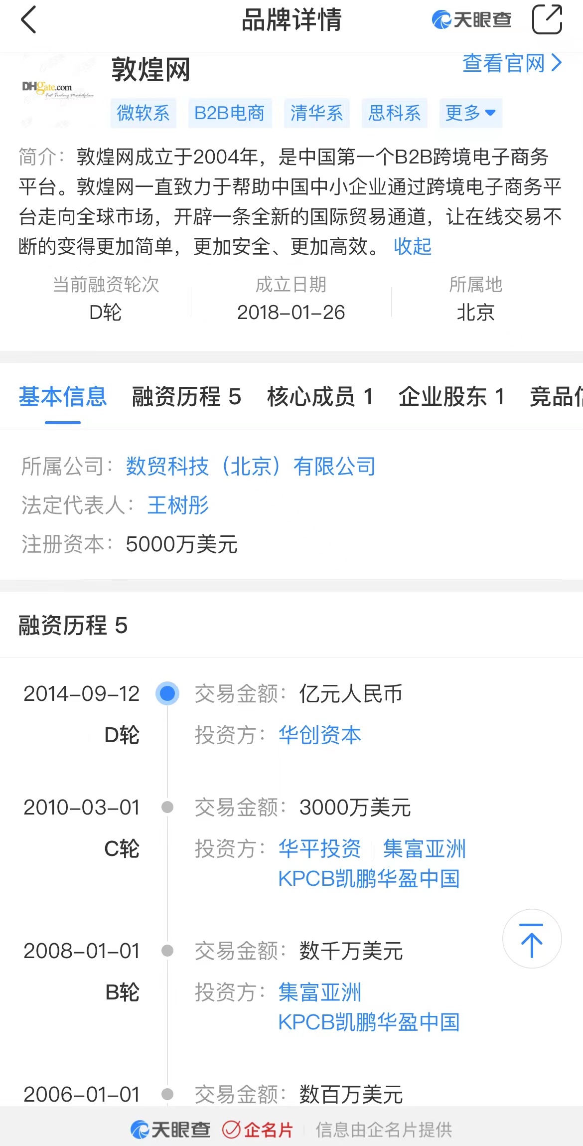 天眼查资料显示,敦煌网成立于2004年,是中国第一个B2B跨境电子商务平台。敦煌网一直致力于帮助中国中小企业通过跨境电子商务平台走向全球市场,开辟一条全新的国际贸易通道,让在线交易不断的变得更加简单,更加安全、更加高效。