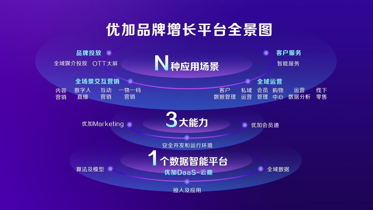 具体来看,“1”是指底层的DaaS平台,其优势包括领先的数据智能;依托全面自营模式融合了人、货、场的高质量数据;聚集了众多经验丰富的生态伙伴,贴近品牌商需求。“3”指三大基础能力,即支持营销策略的优加Marketing,实现统一视角会员管理的会员通,以及支持应用独立部署的开发运行平台。“N”指最上层的N个场景,覆盖投放、全场景互动营销、全域运营和智能客服等领域,更好地满足品牌商多样化需求。