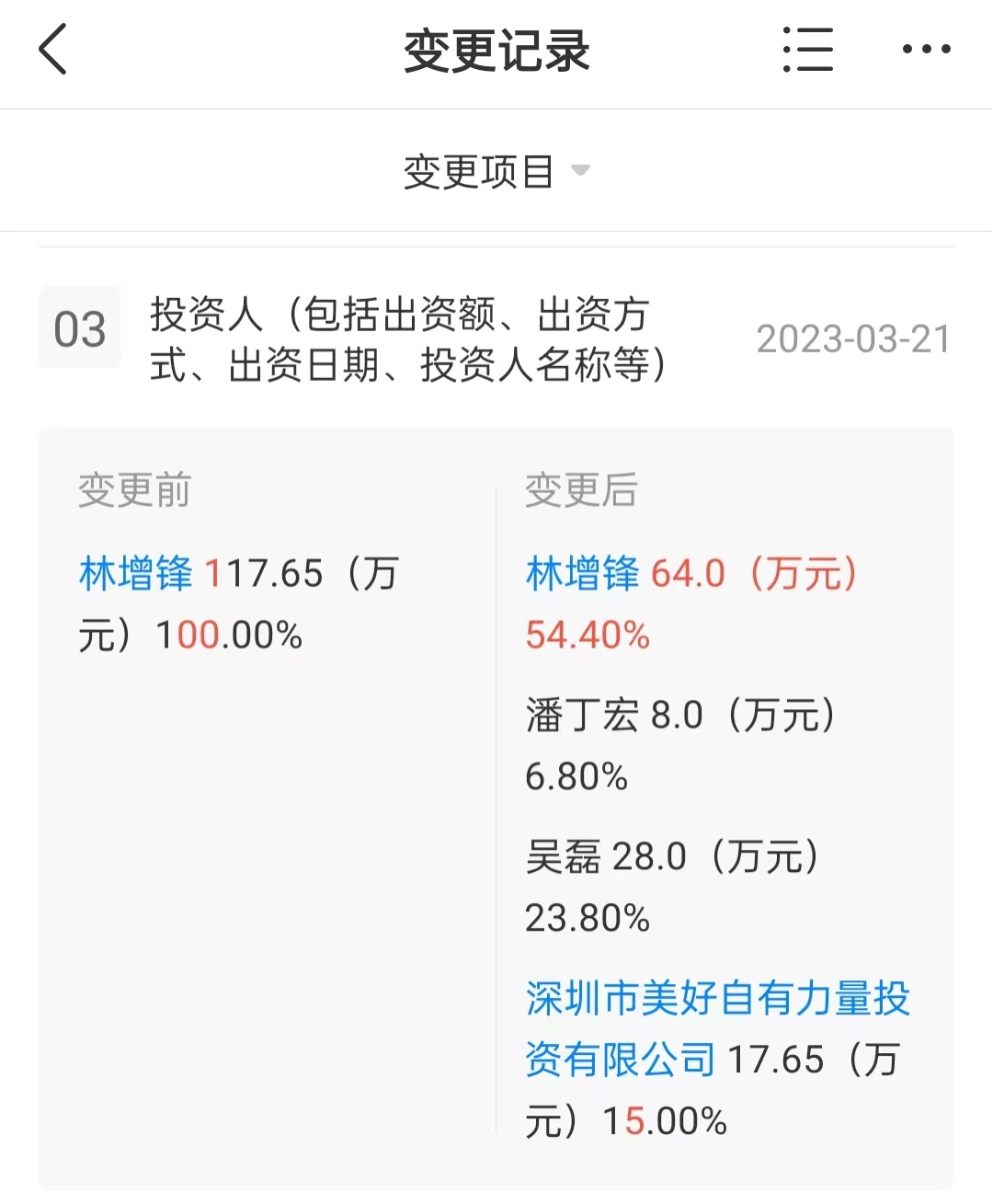 信息显示,深圳市美好自有力量投资有限公司成立于2022年3月,法定代表人为黄锦华,注册资本5000万人民币,经营范围包括创业投资、以自有资金从事投资活动;社会经济咨询服务;企业管理咨询;信息咨询服务;住房租赁;国内贸易代理等。