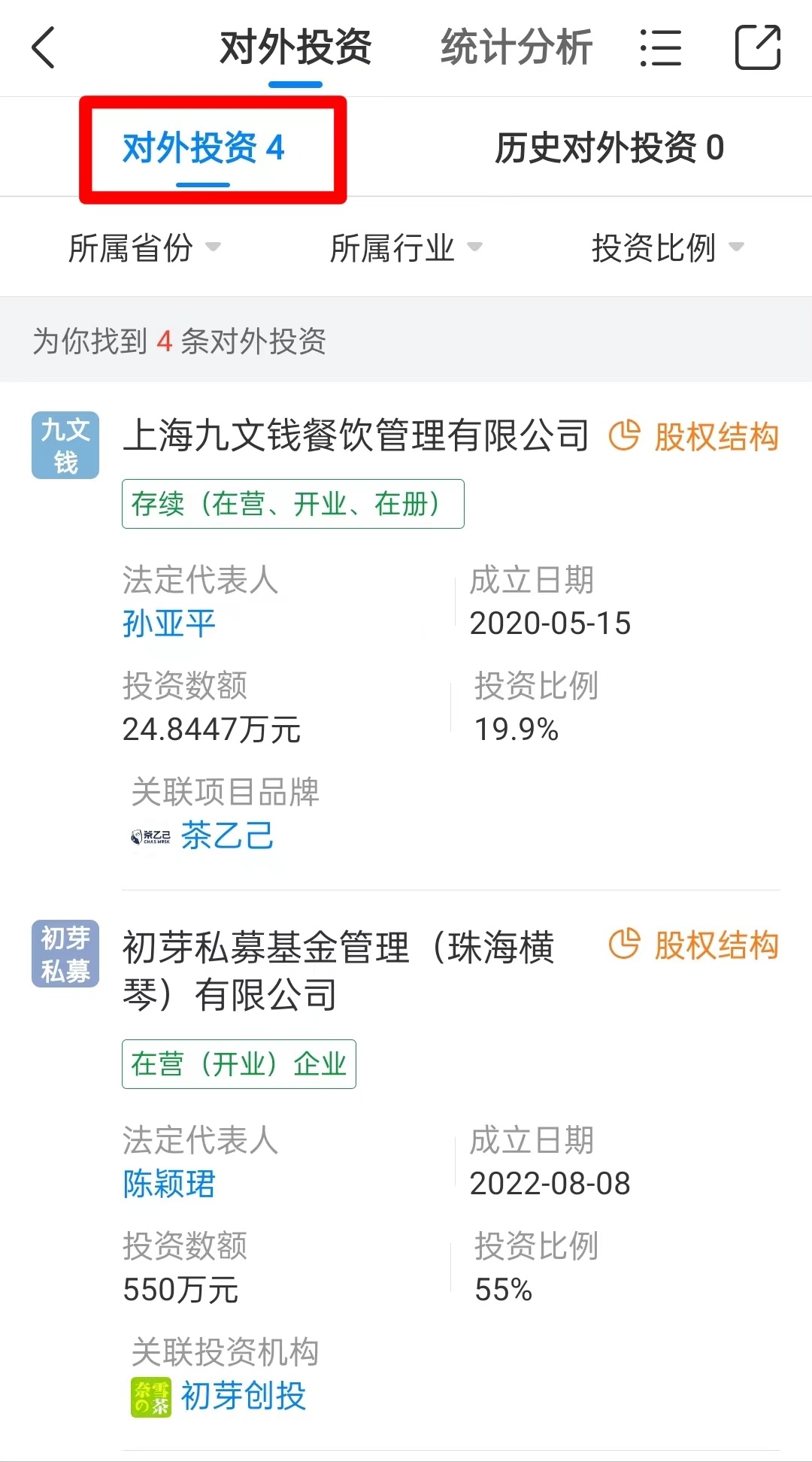 据天眼查不完全统计,成立至今,深圳市美好自有力量投资有限公司已对外投资4家公司,分布于广东、北京、上海,余下3家分别是上海九文钱餐饮管理有限公司、初芽私募基金管理(珠海横琴)有限公司、北京象飞田餐饮管理有限公司。