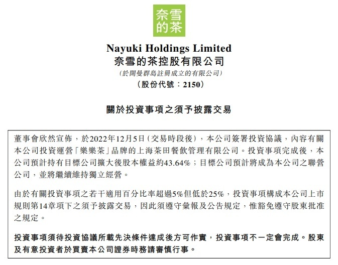 值得一提的是,除投资咖啡品牌“怪物困了”外,2022年12月,奈雪的茶控股有限公司还发布公告称,已签署对乐乐茶主体公司上海茶田餐饮管理有限公司的投资协议,总投资金额5.25亿元。投资事项完成后,奈雪的茶将持有目标公司43.64%股本权益,即奈雪将成为乐乐茶第一大股东。
