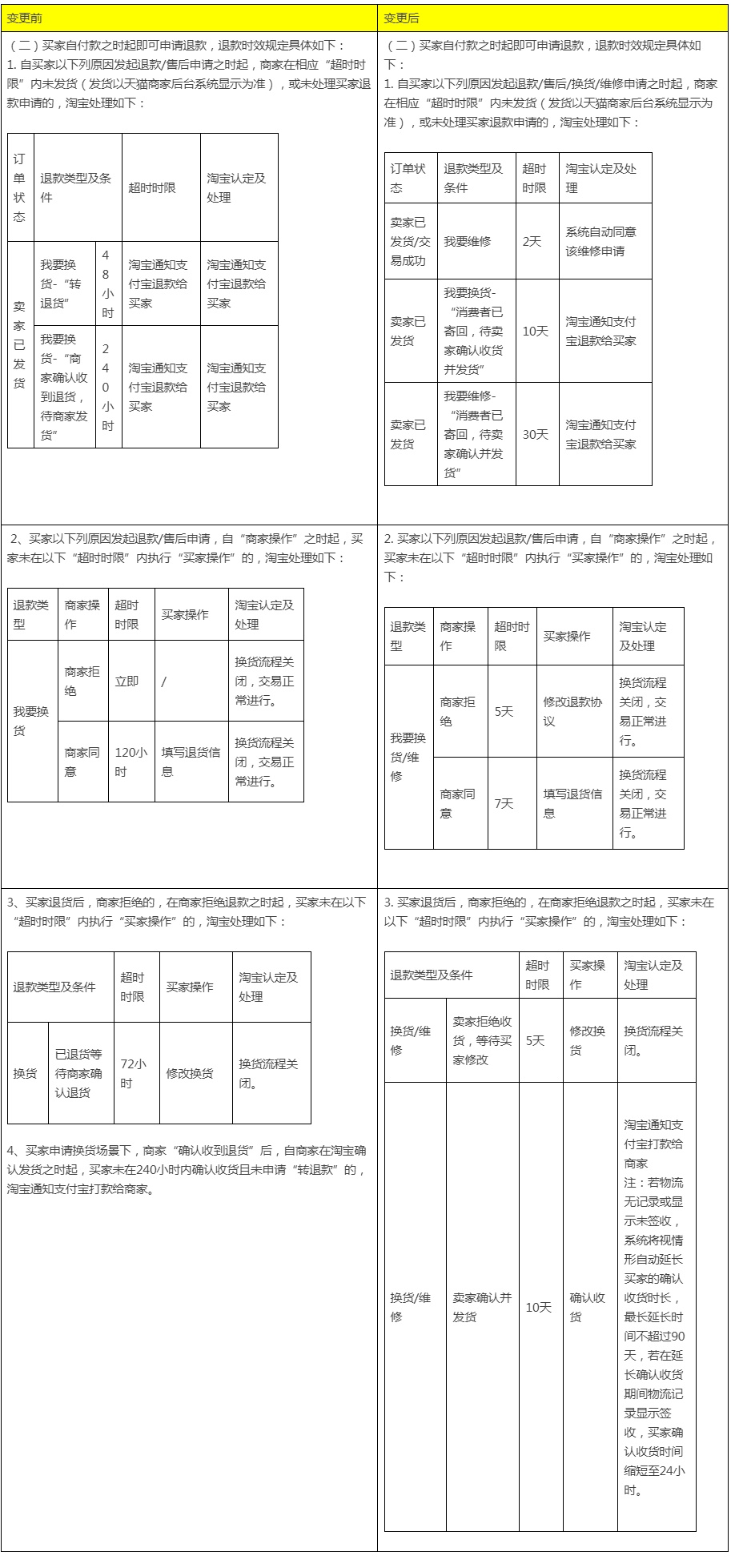 公告显示,变更后,自买家以下列原因发起退款/售后/换货/维修申请之时起,商家在相应“超时时限”内未发货(发货以天猫商家后台系统显示为准),或未处理买家退款申请的,淘宝处理如下:订单状态卖家已发货/交易成功,退款类型及条件为我要维修,超时时限为2天,淘宝认定及处理为系统自动同意该维修申请;订单状态卖家已发货,退款类型及条件为我要换货-“消费者已寄回,待卖家确认收货并发货”,超时时限为10天,淘宝认定及处理为淘宝通知支付宝退款给买家;订单状态卖家已发货,退款类型及条件为我要维修-“消费者已寄回,待卖家确认并发货”,超时时限为30天,淘宝认定及处理为淘宝通知支付宝退款给买家。
