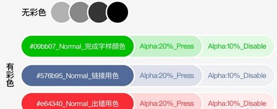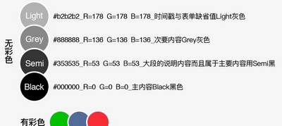 字体颜色规范:无彩色——主内容Black黑色,次要内容Grey灰色;时间戳与表单缺省值Light灰色;大段的说明内容而且属于主要内容用Semi黑;