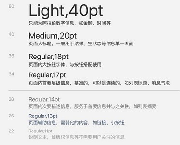 字体规范:小程序的字体依然遵循微信原生视觉规范:微信内字体的使用与所运行的系统字体保持一致,常用字号为20, 18, 17, 16,14 13, 11(pt),使用场景具体如上图。