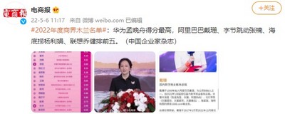 5月6日消息,日前,由中国企业家杂志评选的“2022年度商界木兰”名单公布,华为孟晚舟登顶,综合得分4.81分;阿里巴巴戴珊排名第二,综合得分4.71分;字节跳动张楠排名第三,综合得分4.70分;海底捞杨利娟排名第四,综合得分4.57分;联想乔健排名第五,综合得分4.44分。本次评选的主题是“姐宇宙,无定义”。真正的“姐姐”,无需被定义和标签。