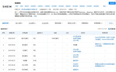 天眼查信息显示,截至目前,SheIn已完成6轮融资,分别是500万美元A轮融资、3亿元B轮融资、数亿美元C轮融资、5亿美元D轮融资、数亿美元E轮融资。投资方包括红杉资本中国、Tiger Global Management、顺为资本、嘉远资本、IDG资本、景林投资、集富亚洲JAFCO。