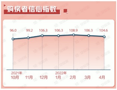 根据统计,2022年4月用户信心指数为104.6,环比下跌1.6%。本月有46.9%的购房者认为5月份楼市政策的走向会继续保持稳定,也有42.2%的购房者认为楼市政策将略微放松;53.1%的购房者认为房价走势将继续保持平稳;有35.9%的购房者认为2022年5月是买房的好时机。