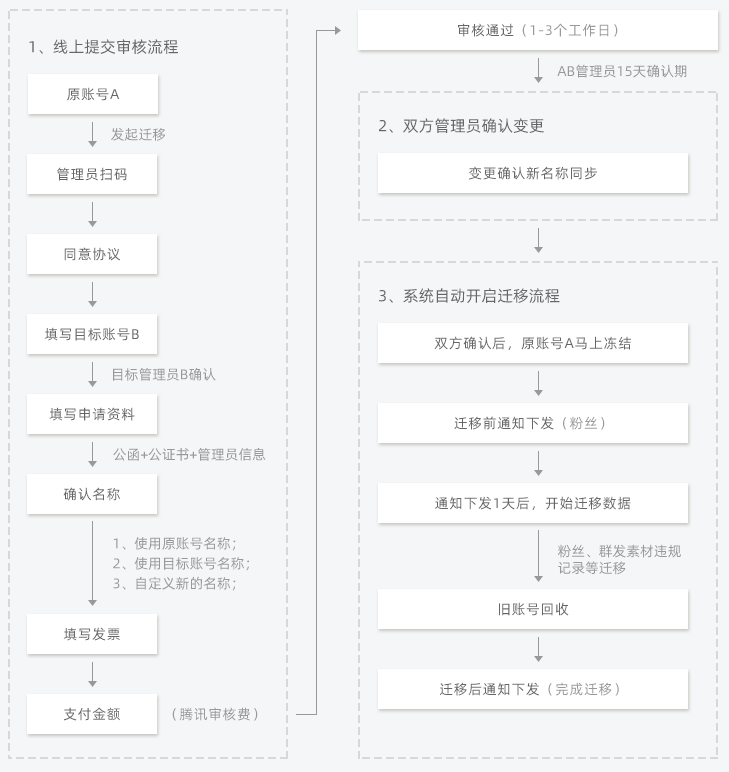 注:双方管理员必须在审核成功后的15天内确认迁 移通知,超时则自动失效需要重新发起; 如审核成功后未收到迁移确认通知,可在公众号后 台进入账号迁移页面点击发送通知,每天只可下发 一次。
