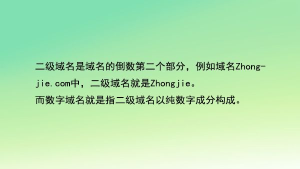ningtui.com在介绍数字域名之前,先介绍一下二级域名是什么。二级域名是域名的倒数第二个部分,例如域名ningtui.com中,二级域名就是Zhongjie。而数字域名就是指二级域名以纯数字成分构成。