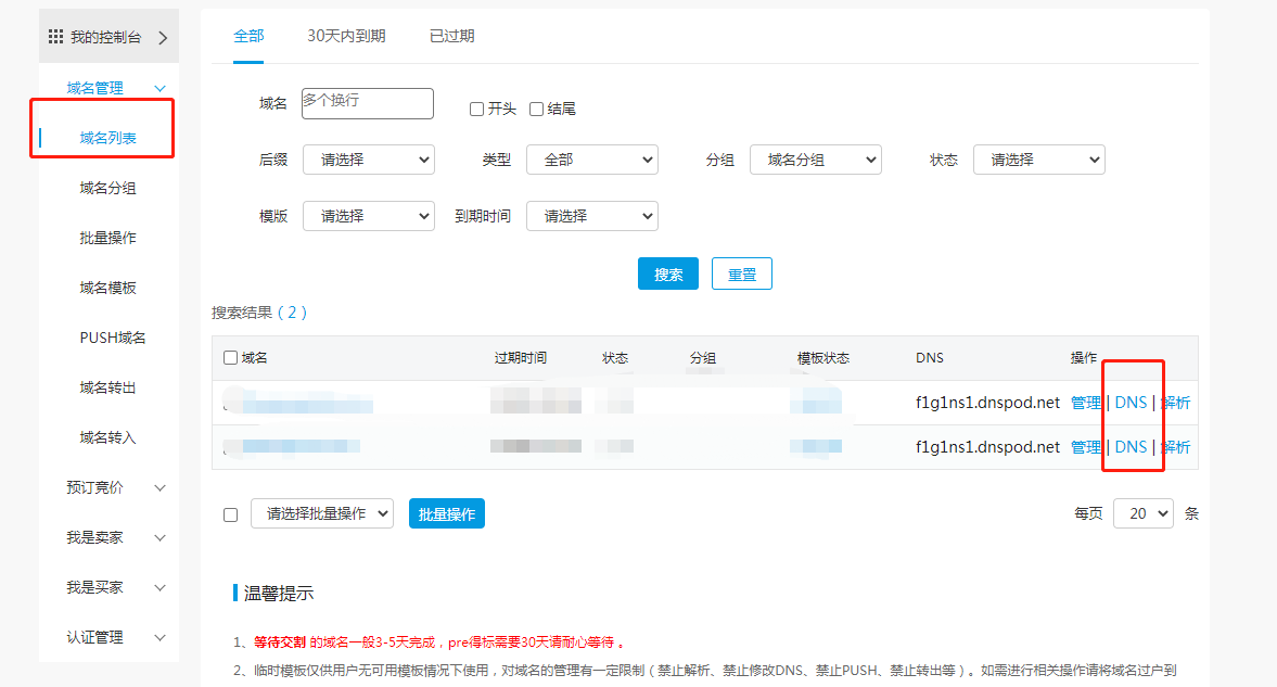 1. 此操作可以批量修改多个域名DNS,务必修改的DNS是正确的,否则会出现失败问题。