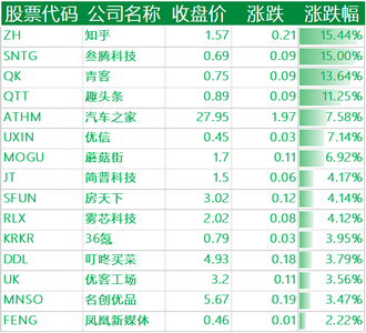 中概股中主要科技股多数上涨,“腾讯系”普涨,其中知乎涨超 15%、趣头条涨超 11%、蘑菇街涨近 7%、涂鸦智能、腾讯音乐、斗鱼、虎牙、拼多多、哔哩哔哩跟涨。