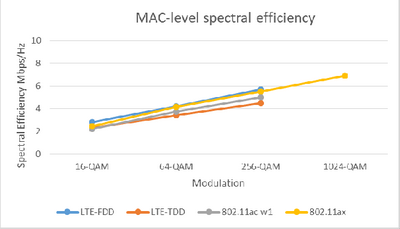 两种方案都能让信道得到充分的利用。参考 Aruba Networks 发布的测试结果可以看出,LTE 和 Wi-Fi 6 在 MAC 层面的频谱使用效率非常接近,单流、256QAM 的情况下,都能到 5Mbps / Hz 以上的频谱使用效率。