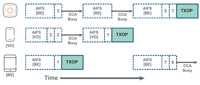 Wi-Fi 将数据分为四种不同的优先级,从上到下分别为语音(VO),视频(VI),最大努力(BE)和背景(BK)。每一个级别,都会附上不同的 AIFS 值。AIFS 值越低,发送优先级越高。