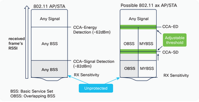 进入仲裁过程的 Wi-Fi 设备,首先开启信道侦听模式,RF 接收机对无线信道中的 802.11 信号进行监测(Signal Detection)。如果侦听到的信号强度低于其 SD 阈值(以下图思科的方案为例,阈值为-82dBm)时,设备判定目前信道没有其他 Wi-Fi 设备在使用。