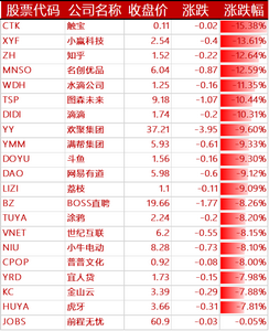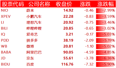 美股收跌 百度京东微博拼多多跌逾 5% 滴滴知乎跌超 10%