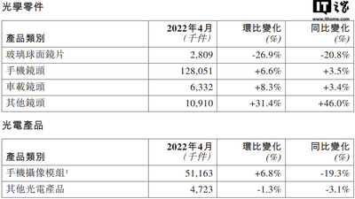 宁推网 5 月 11 日消息,舜宇光学科技本周发布公告,披露了 2022 年 4 月主要产品的出货量。