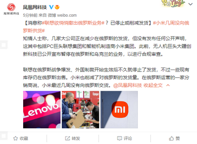 联想在俄乌冲突爆发、外国制裁开始生效后不久就停止了发货,不过一些现有库存仍在俄罗斯出售。小米也削减了对俄罗斯的发货量。在俄罗斯运营的一家分销商说,小米最近几周没有向俄罗斯交货。