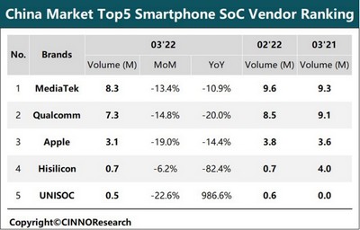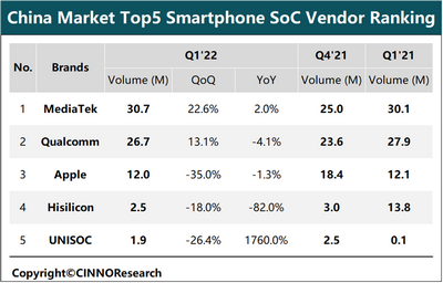 联发科高通苹果华为海思紫光展锐前五 CINNO Research 中国手机 SoC Q1 排名出炉
