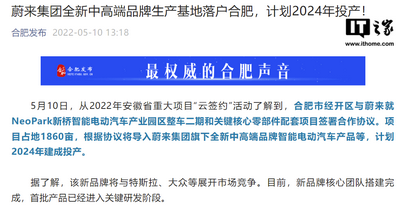 报道称,该项目占地 1860 亩,根据协议将导入蔚来集团旗下全新中高端品牌智能电动汽车产品等,计划 2024 年建成投产。目前,新品牌核心团队搭建完成,首批产品已进入关键研发阶段。