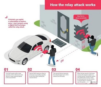 该方法需要将一台解码感应设备靠近车主的手机或密钥卡,采集相应的数字密码传输给汽车旁的接收设备,这时车辆会误以为接收设备就是密钥,经过简单操作后车门就能被打开了。