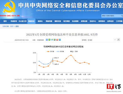 宁推网 5 月 19 日消息,据中国网信网,2022 年 4 月,全国各级网络举报部门受理举报 1602.9 万件,环比增长 27.4%、同比增长 7.2%。