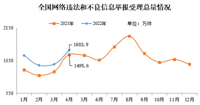 2022 年 4 月全国受理网络违法和不良信息举报 1602.9 万件 同比增长 7.2%