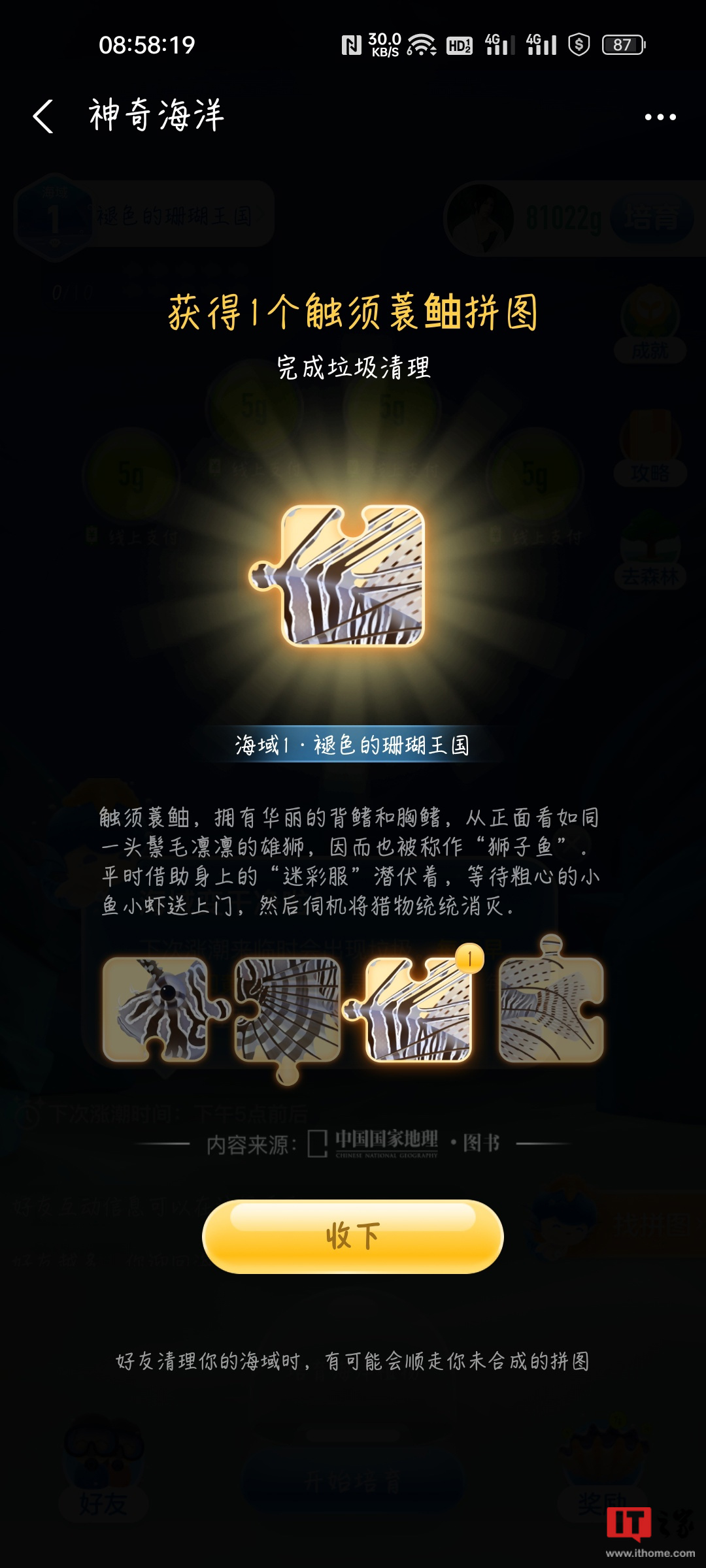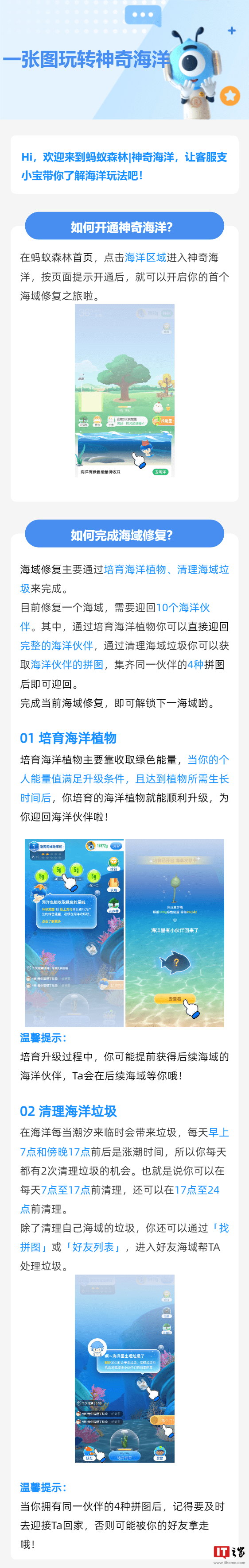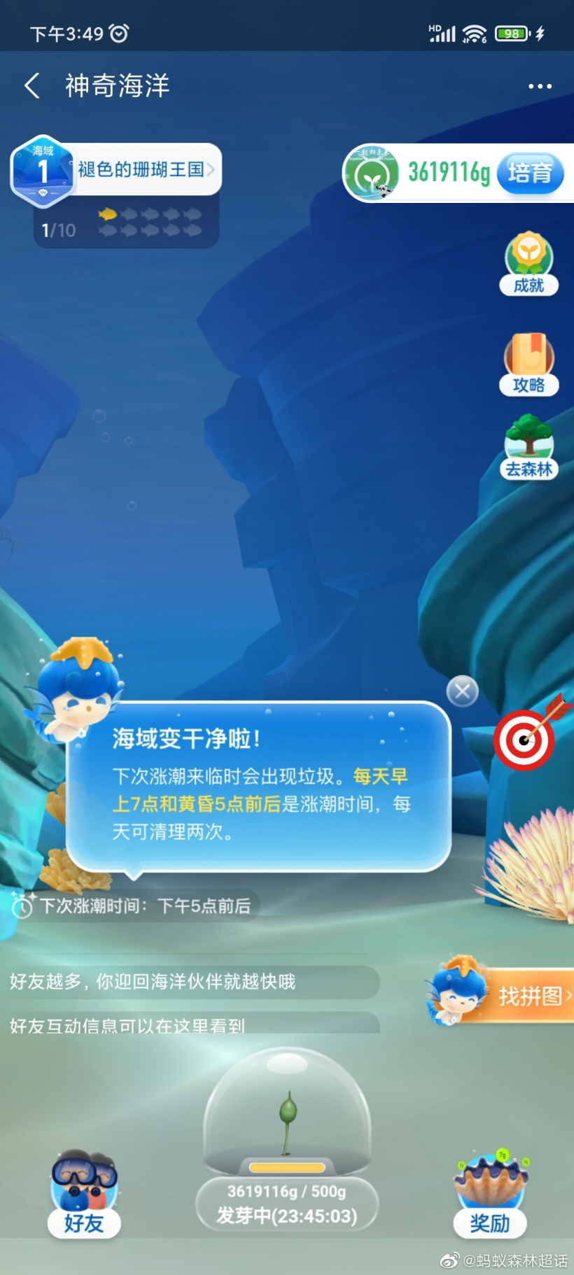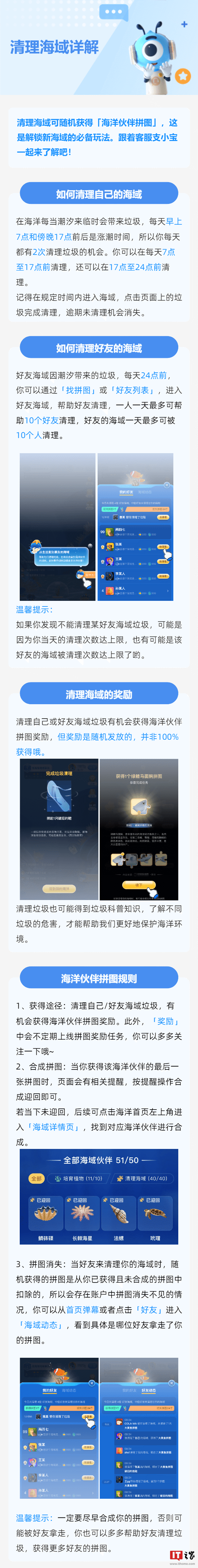 2、完成修复的标志:需要获得该海域的全部海洋伙伴,即为修复完成。【前期:每个海域需要迎回 10 条海洋伙伴,其中包括 2 条培育所得、8 条互动(清理海域 / 任务)所得】