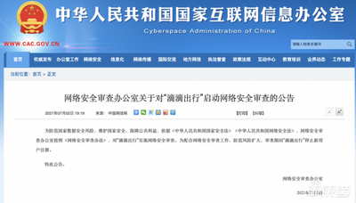 2021 年 7 月 2 日,国家互联网信息办公室发布公告称,为防范国家数据安全风险,维护国家安全,保障公共利益,宣布对“滴滴出行”实施网络安全审查。为配合网络安全审查工作,防范风险扩大,审查期间“滴滴出行”停止新用户注册。