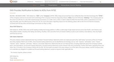 滴滴正式投票从纽交所退市 计划于 6 月 2 日或之后递交文件