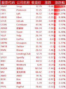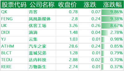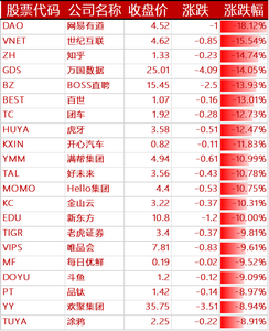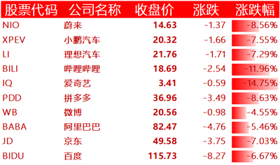 声网跌超 19%,网易有道跌超 18%,世纪互联跌超 15%,爱奇艺、知乎跌超 14%,BOSS 直聘跌近 14%,百世集团跌超 13%,虎牙、达达集团跌超 12%,哔哩哔哩、每日优鲜跌近 12%,开心汽车、逸仙电商跌超 11%,满帮跌近 11%,金山云跌超 10%,新东方跌 10%,老虎证券跌近 10%,唯品会、乐居、斗鱼跌超 9%,欢聚集团跌近 9%,拼多多、蔚来汽车、新氧跌超 8%,京东、小鹏汽车、理想汽车、腾讯音乐、迅雷、高途、云米科技、波奇宠物跌超 7%,小牛电动、嘉楠科技跌近 7%,百度跌超 6%,贝壳、雾芯科技跌近 6%,陆金所控股、趣头条、携程、中通跌近 5%,途牛跌 4%,搜狐、腾讯 ADR、中网载线跌超 3%,瑞幸粉单、36 氪、微美全息、名创优品跌超 2%,水滴公司、怪兽充电跌近 2%,网易、优信、法拉第未来跌超 1%,叮咚买菜跌 1%。青客涨近 10%,凤凰新媒体涨超 9%,极光涨近 3%。