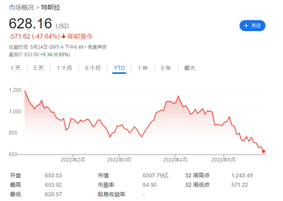 中概股中主要科技股全线下跌,“蔚小理”跌幅均超过 7%。此外,之前屡创佳绩的特斯拉今年持续下跌,今天再次创下今年以来的历史低位,今年已跌去 47.64%。