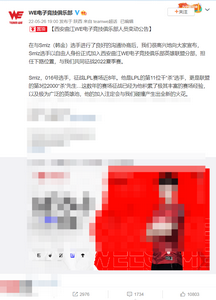 宁推网 5 月 26 日消息,今日晚间,西安曲江 WE 电子竞技俱乐部发布人员变动公告。Smlz 选手以自由人身份正式加入西安曲江 WE 电子竞技俱乐部英雄联盟分部,担任下路位置,征战 2022 夏季赛。