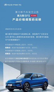 宁推网 5 月 6 日消息,赛力斯汽车官方发布产品价格调整说明称,受汽车上游原材料成本涨价影响,赛力斯华为智选 SF5 自今日起调价,全系上调幅度为 2 万元。