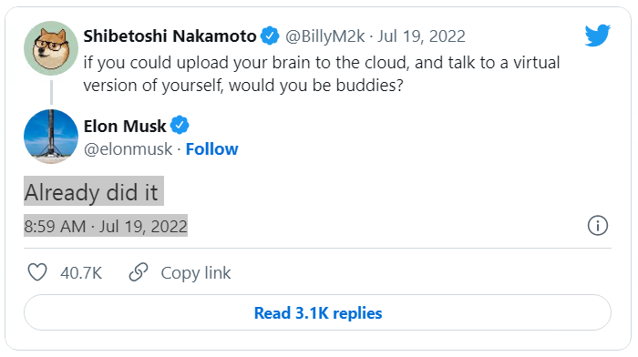特斯拉公司首席执行官 埃隆·马斯克 ( Elon Musk ) 表示,在将自己的大脑上传到云端后,他已经与自己的虚拟版本进行了交谈。最近,在回答狗狗币创始人比利马库斯的Twitter时,马斯克回答说:“我已经做了”